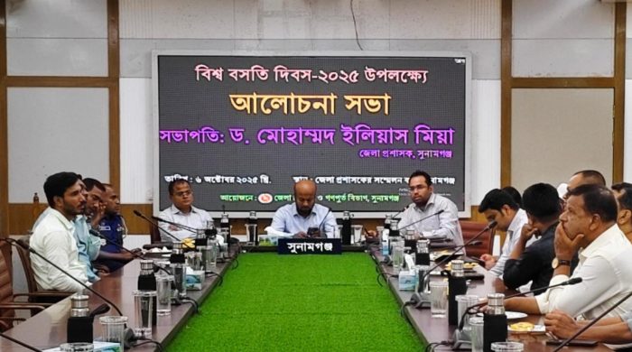 স্টাফ রিপোর্টারঃবিশ্ব বসতি দিবস ২০২৫ উপলক্ষে সুনামগঞ্জ জেলা প্রশাসনের উদ্যোগে আলোচনা সভা অনুষ্ঠিত হয়েছে। রবিবার (৬ অক্টোবর) সকালে জেলা প্রশাসকের সম্মেলন কক্ষে এ সভার আয়োজন করা হয়। সভায় সভাপতিত্ব করেন অতিরিক্ত জেলা প্রশাসক (রাজস্ব) রেজাউল করিম।এ সময় উপস্থিত ছিলেন অতিরিক্ত জেলা প্রশাসক (সার্বিক) সমর কুমার পাল এবং গণপূর্ত বিভাগ সুনামগঞ্জের নির্বাহী প্রকৌশলী নাজমুল হাসান হিরা। আরোও..