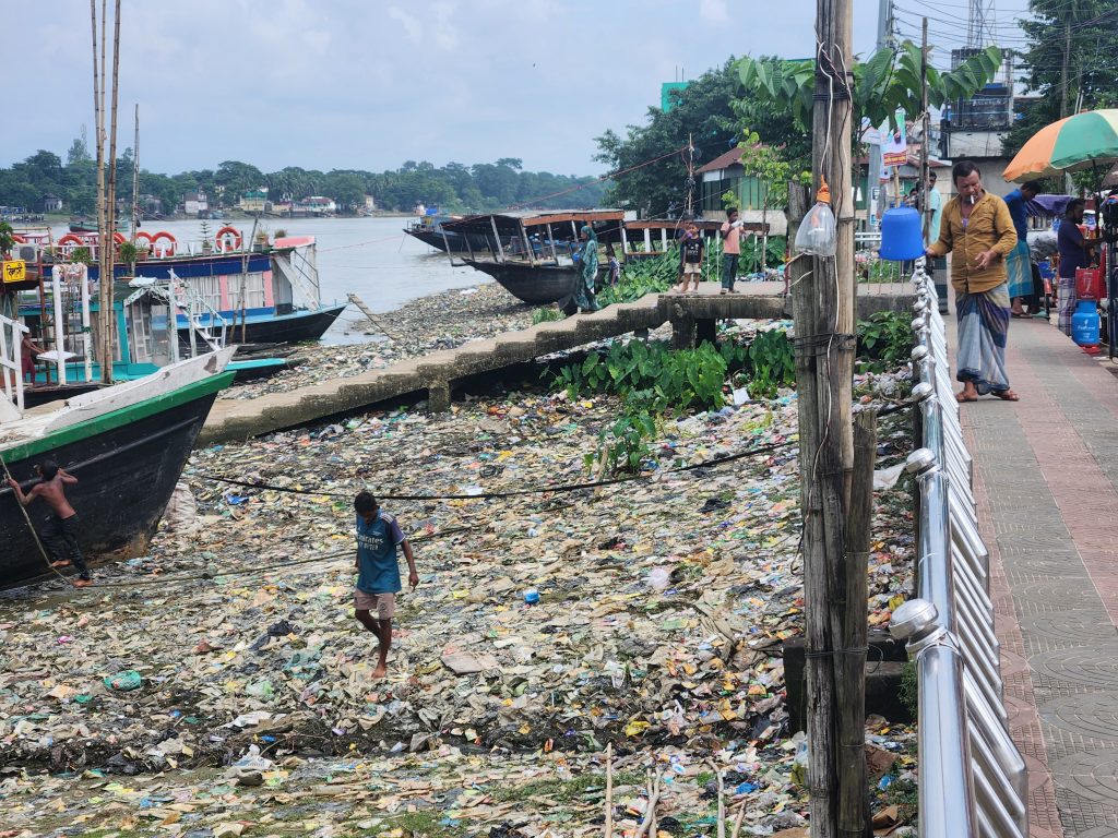 সরেজমিনে দেখা গেছে, শহরের বৈঠাখালি নৌকাঘাট থেকে শুরু করে দক্ষিণ বড়পাড়া, তেঘরিয়া, পুরানপাড়া, মড়লহাটি, সাহেববাড়ি ঘাট, উত্তর আরপিননগর, পশ্চিম বাজার, চাঁদনিঘাট, জগন্নাথবাড়ি, কাঁচাবাজার হয়ে নবীনগর পর্যন্ত নদীর তীর ময়লায় জর্জরিত। কোথাও ড্রেনের ময়লা সরাসরি নদীতে গিয়ে মিলছে, কোথাও নদীর পাড়ে গড়ে উঠেছে আবর্জনার ছোট ছোট স্তূপ।